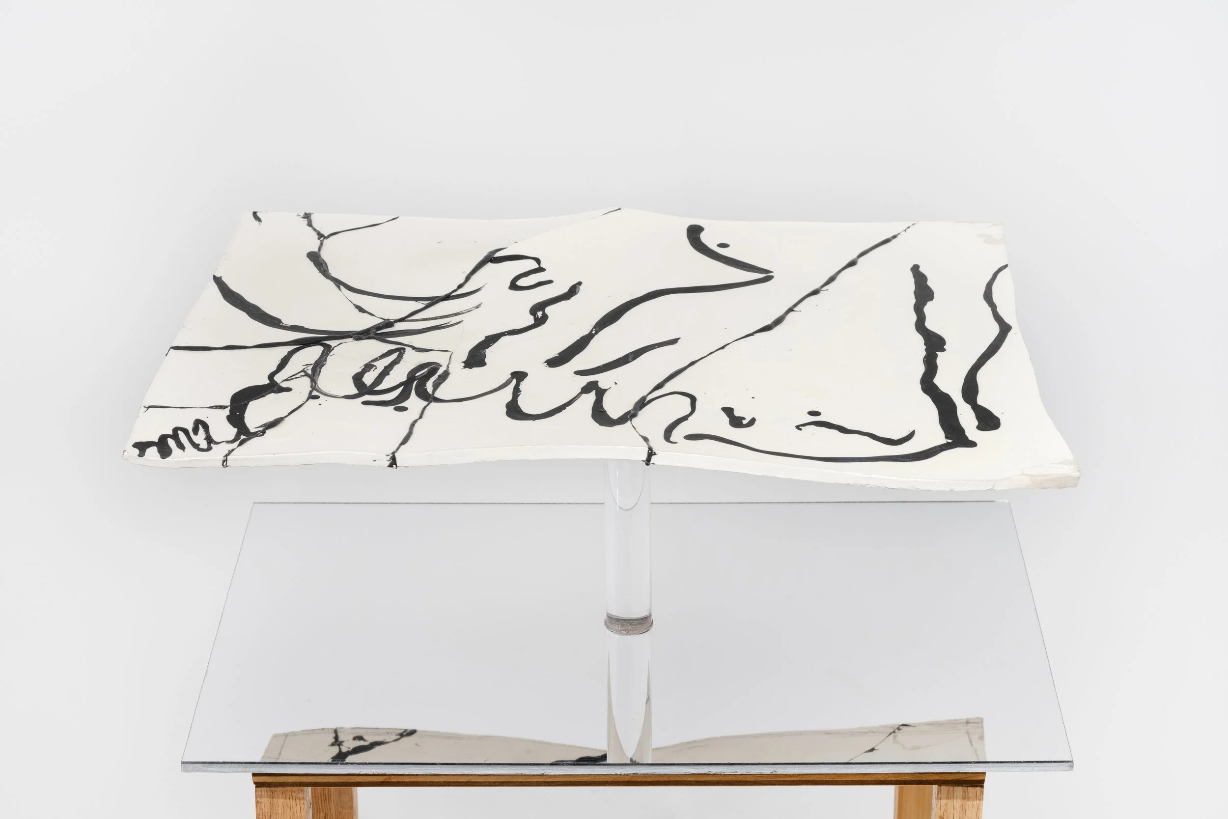 Glazed ceramic, epoxy, acrylic rod, acrylic mirror acrylic on gray plastic, wood, gouache, or black ink