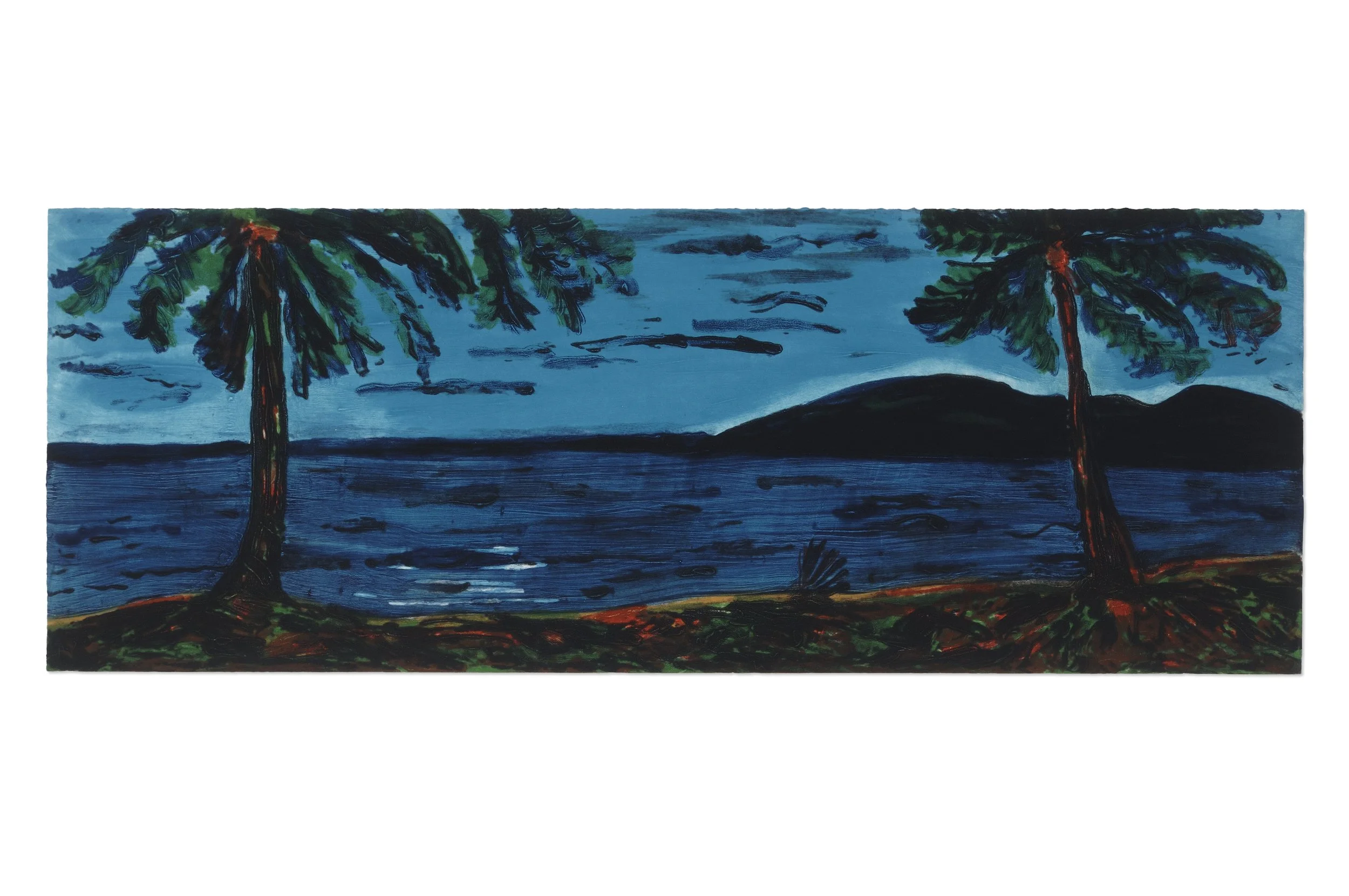 Produced between 1989 and 1993, this group of prints captures the intensity of the Caribbean landscape. Through saturated colors, deep shadow, and expressive figuration, Ferrer renders scenes that feel both painterly and tactile. This work depicts sunset vistas, burning bonfires, and calm waters against lush tropical foliage, evoking moments where light and color heighten the sensory experience of place.