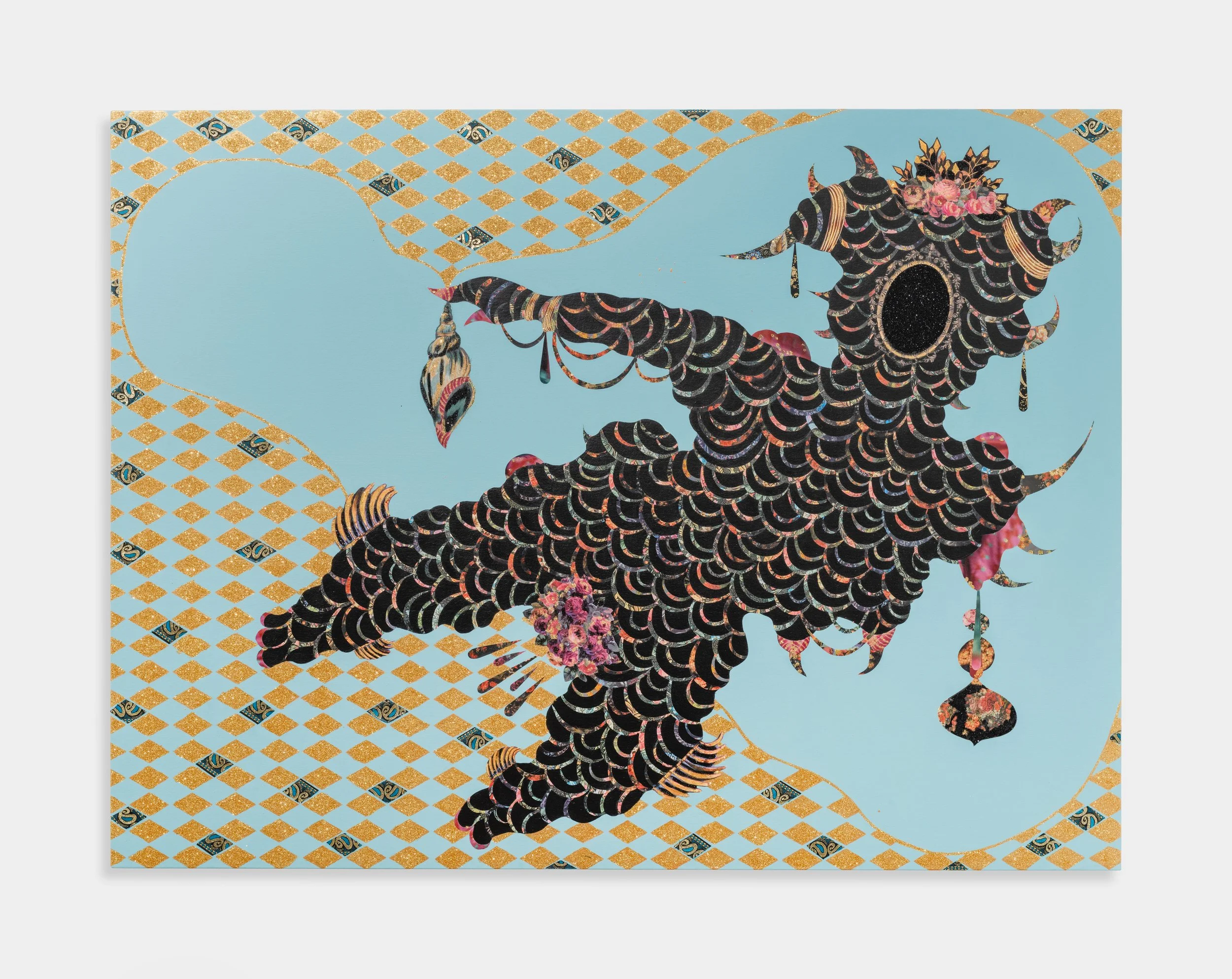 Acrylic, glitter, and decorative paper collage on canvas on panel